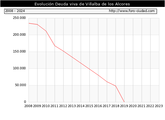 Villalba de los Alcores - Deuda viva del Ayuntamiento a 31/12/2024 Villalba de los Alcores - Deuda viva del Ayuntamiento a 31/12/2024 Segun el Ministerio de Economia y Hacienda el Ayuntamiento de Villalba de los Alcores a 31/12/2024 posee una deuda de 0 € . La deuda viva a 31/12/2023 ascendia a 0 € por lo que en el ultimo año la deuda se mantuvo igual. ![]()
