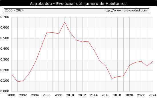 el numero de habitantes en Astrabudua era de 10.286, 46 habitantes mas que el en el año 2023. En el grafico siguiente se puede ver cuantos habitantes tiene Astrabudua a lo largo de los años.