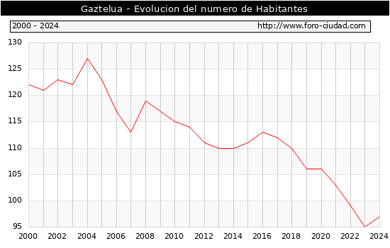 el numero de habitantes en Gaztelua era de 97, 2 habitantes mas que el en el año 2023. En el grafico siguiente se puede ver cuantos habitantes tiene Gaztelua a lo largo de los años.