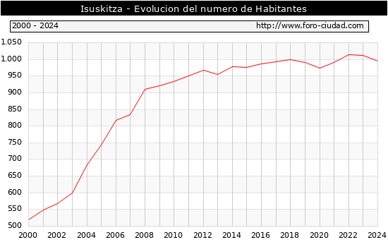 Segun los datos publicados por el INE a 1 de Enero de 2024 el numero de habitantes en Isuskitza era de 995, 16 habitantes menos que el en el año 2023. En el grafico siguiente se puede ver cuantos habitantes tiene Isuskitza a lo largo de los años.