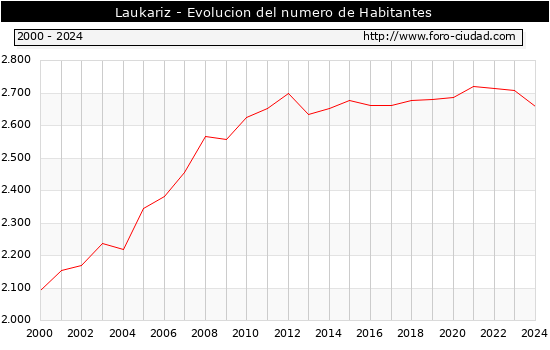 Segun los datos publicados por el INE a 1 de Enero de 2024 el numero de habitantes en Laukariz era de 2.658, 49 habitantes menos que el en el año 2023. En el grafico siguiente se puede ver cuantos habitantes tiene Laukariz a lo largo de los años.