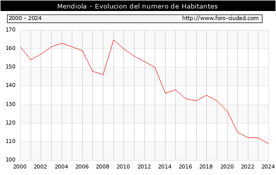 el numero de habitantes en Mendiola era de 109, 3 habitantes menos que el en el año 2023. En el grafico siguiente se puede ver cuantos habitantes tiene Mendiola a lo largo de los años.
