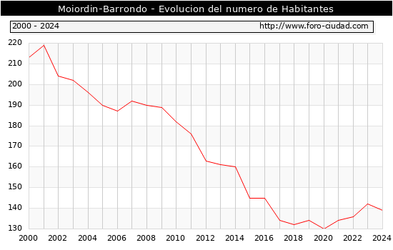 el numero de habitantes en Moiordin-Barrondo era de 139, 3 habitantes menos que el en el año 2023. En el grafico siguiente se puede ver cuantos habitantes tiene Moiordin-Barrondo a lo largo de los años.