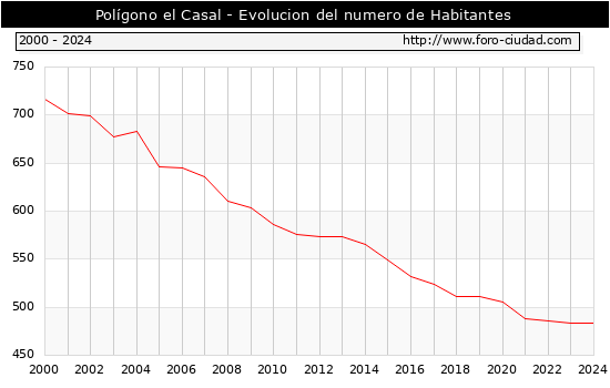 el numero de habitantes en Polígono el Casal era de 483, igual numero de habitantes que el en el año 2023. En el grafico siguiente se puede ver cuantos habitantes tiene Polígono el Casal a lo largo de los años.