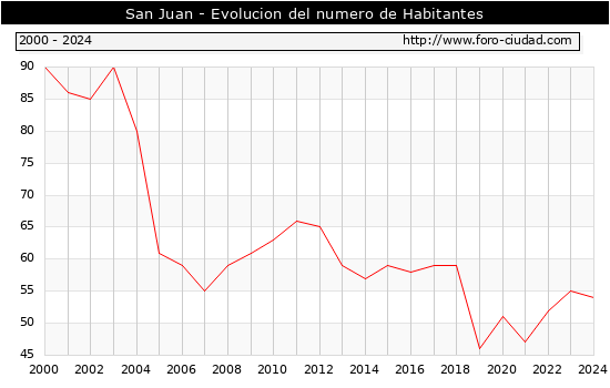 el numero de habitantes en San Juan era de 54, 1 habitantes menos que el en el año 2023. En el grafico siguiente se puede ver cuantos habitantes tiene San Juan a lo largo de los años.