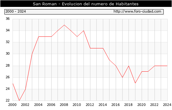 el numero de habitantes en San Roman era de 28, igual numero de habitantes que el en el año 2023. En el grafico siguiente se puede ver cuantos habitantes tiene San Roman a lo largo de los años.