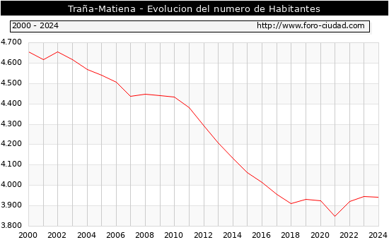 el numero de habitantes en Traña-Matiena era de 3.942, 2 habitantes menos que el en el año 2023. En el grafico siguiente se puede ver cuantos habitantes tiene Traña-Matiena a lo largo de los años.