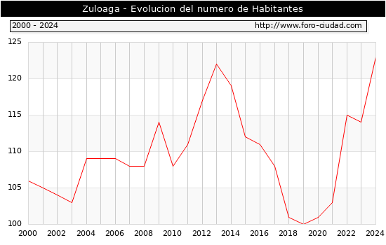 Segun los datos publicados por el INE a 1 de Enero de 2024 el numero de habitantes en Zuloaga era de 123, 9 habitantes mas que el en el año 2023. En el grafico siguiente se puede ver cuantos habitantes tiene Zuloaga a lo largo de los años.