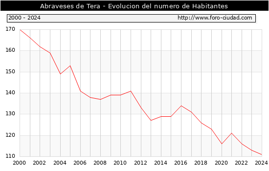 el numero de habitantes en Abraveses de Tera era de 111, 2 habitantes menos que el en el año 2023. En el grafico siguiente se puede ver cuantos habitantes tiene Abraveses de Tera a lo largo de los años.