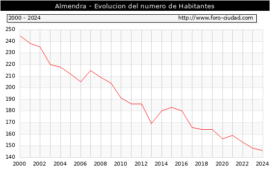 el numero de habitantes en Almendra era de 146, 2 habitantes menos que el en el año 2023. En el grafico siguiente se puede ver cuantos habitantes tiene Almendra a lo largo de los años.