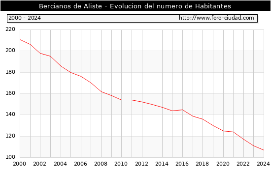 el numero de habitantes en Bercianos de Aliste era de 107, 4 habitantes menos que el en el año 2023. En el grafico siguiente se puede ver cuantos habitantes tiene Bercianos de Aliste a lo largo de los años.