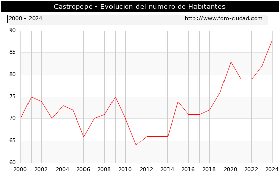 el numero de habitantes en Castropepe era de 88, 6 habitantes mas que el en el año 2023. En el grafico siguiente se puede ver cuantos habitantes tiene Castropepe a lo largo de los años.