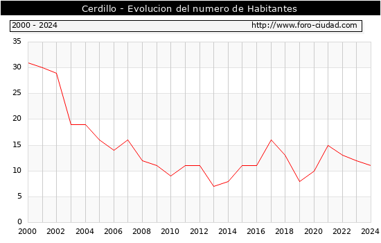 el numero de habitantes en Cerdillo era de 11, 1 habitantes menos que el en el año 2023. En el grafico siguiente se puede ver cuantos habitantes tiene Cerdillo a lo largo de los años.