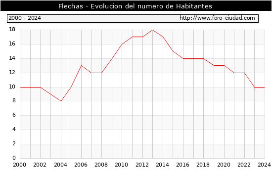 el numero de habitantes en Flechas era de 10, igual numero de habitantes que el en el año 2023. En el grafico siguiente se puede ver cuantos habitantes tiene Flechas a lo largo de los años.
