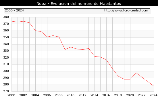 el numero de habitantes en Nuez era de 278, 7 habitantes menos que el en el año 2023. En el grafico siguiente se puede ver cuantos habitantes tiene Nuez a lo largo de los años.