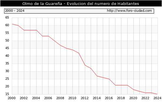 el numero de habitantes en Olmo de la Guareña era de 15, 1 habitantes menos que el en el año 2023. En el grafico siguiente se puede ver cuantos habitantes tiene Olmo de la Guareña a lo largo de los años.