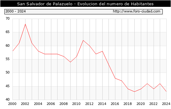 el numero de habitantes en San Salvador de Palazuelo era de 43, 3 habitantes menos que el en el año 2023. En el grafico siguiente se puede ver cuantos habitantes tiene San Salvador de Palazuelo a lo largo de los años.