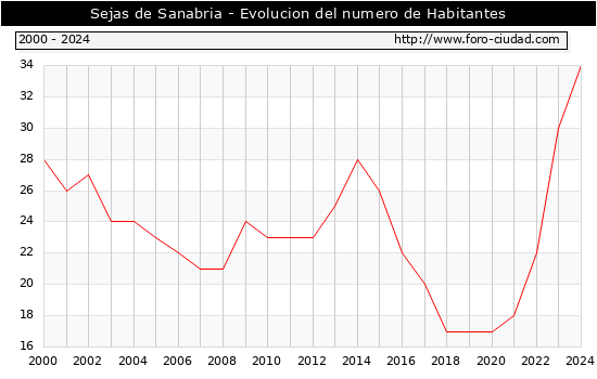 el numero de habitantes en Sejas de Sanabria era de 34, 4 habitantes mas que el en el año 2023. En el grafico siguiente se puede ver cuantos habitantes tiene Sejas de Sanabria a lo largo de los años.