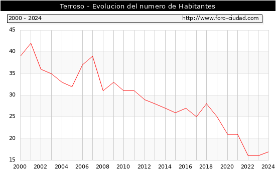 el numero de habitantes en Terroso era de 17, 1 habitantes mas que el en el año 2023. En el grafico siguiente se puede ver cuantos habitantes tiene Terroso a lo largo de los años.