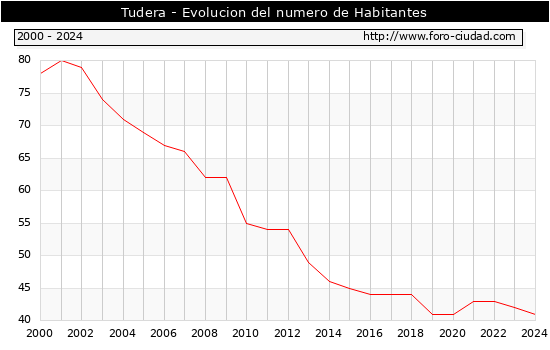 el numero de habitantes en Tudera era de 41, 1 habitantes menos que el en el año 2023. En el grafico siguiente se puede ver cuantos habitantes tiene Tudera a lo largo de los años.