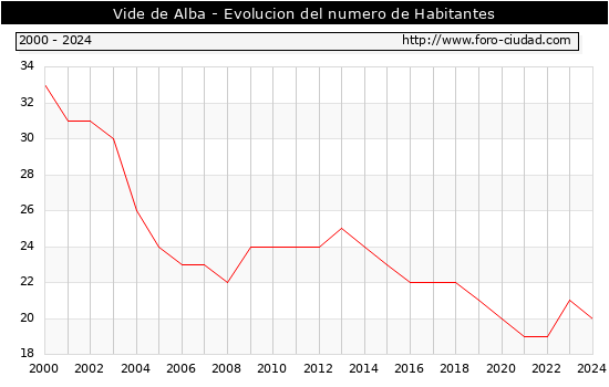 el numero de habitantes en Vide de Alba era de 20, 1 habitantes menos que el en el año 2023. En el grafico siguiente se puede ver cuantos habitantes tiene Vide de Alba a lo largo de los años.