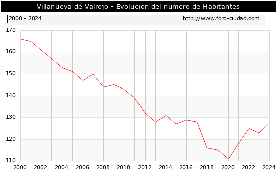 el numero de habitantes en Villanueva de Valrojo era de 128, 5 habitantes mas que el en el año 2023. En el grafico siguiente se puede ver cuantos habitantes tiene Villanueva de Valrojo a lo largo de los años.