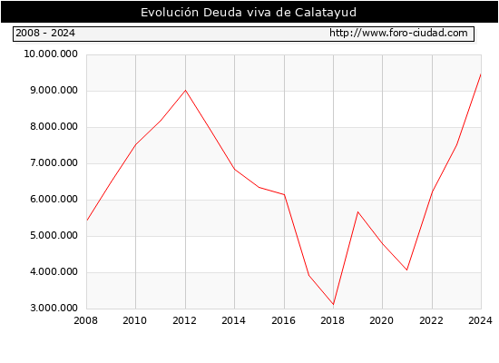 Calatayud - Deuda viva del Ayuntamiento a 31/12/2024 Calatayud - Deuda viva del Ayuntamiento a 31/12/2024 Segun el Ministerio de Economia y Hacienda el Ayuntamiento de Calatayud a 31/12/2024 posee una deuda de 9.501.000 € . La deuda viva a 31/12/2023 ascendia a 7.517.000 € por lo que en el ultimo año la deuda crecio en 1.984.000 €. ![]()