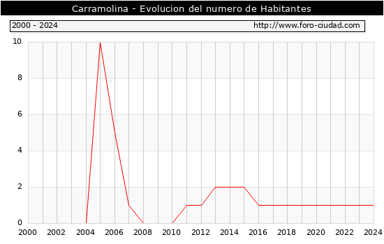 el numero de habitantes en Carramolina era de 1, igual numero de habitantes que el en el año 2023. En el grafico siguiente se puede ver cuantos habitantes tiene Carramolina a lo largo de los años.
