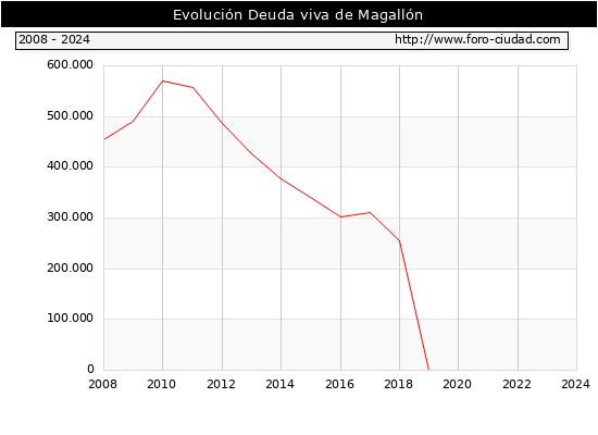Magallón - Deuda viva del Ayuntamiento a 31/12/2024 Magallón - Deuda viva del Ayuntamiento a 31/12/2024 Segun el Ministerio de Economia y Hacienda el Ayuntamiento de Magallón a 31/12/2024 posee una deuda de 0 € . La deuda viva a 31/12/2023 ascendia a 1.000 € por lo que en el ultimo año la deuda se redujo en -1.000 €. ![]()