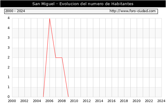 el numero de habitantes en San Miguel era de 0, igual numero de habitantes que el en el año 2023. En el grafico siguiente se puede ver cuantos habitantes tiene San Miguel a lo largo de los años.