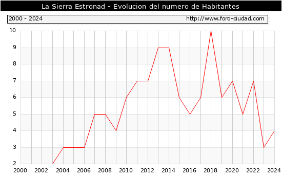 el numero de habitantes en La Sierra Estronad era de 4, 1 habitantes mas que el en el año 2023. En el grafico siguiente se puede ver cuantos habitantes tiene La Sierra Estronad a lo largo de los años.