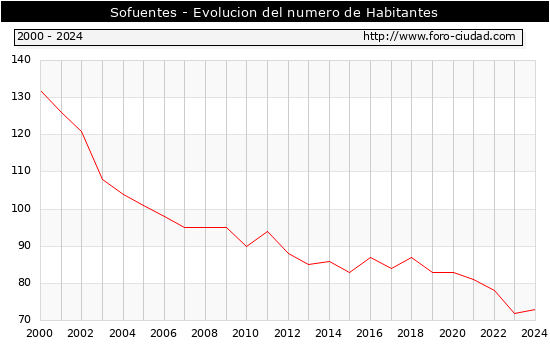 el numero de habitantes en Sofuentes era de 73, 1 habitantes mas que el en el año 2023. En el grafico siguiente se puede ver cuantos habitantes tiene Sofuentes a lo largo de los años.