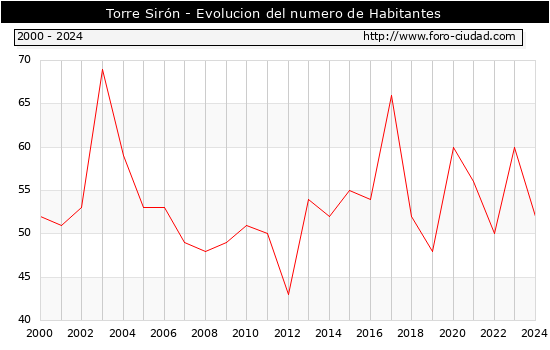el numero de habitantes en Torre Sirón era de 52, 8 habitantes menos que el en el año 2023. En el grafico siguiente se puede ver cuantos habitantes tiene Torre Sirón a lo largo de los años.