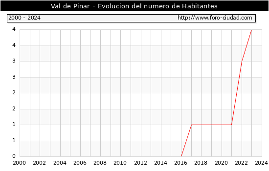 el numero de habitantes en Val de Pinar era de 4, igual numero de habitantes que el en el año 2023. En el grafico siguiente se puede ver cuantos habitantes tiene Val de Pinar a lo largo de los años.