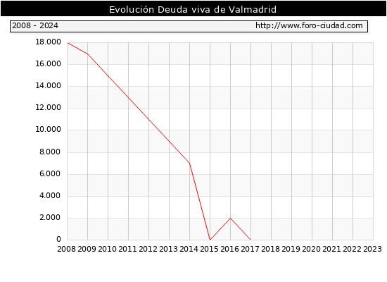 Valmadrid - Deuda viva del Ayuntamiento a 31/12/2024 Valmadrid - Deuda viva del Ayuntamiento a 31/12/2024 Segun el Ministerio de Economia y Hacienda el Ayuntamiento de Valmadrid a 31/12/2024 posee una deuda de 0 € . La deuda viva a 31/12/2023 ascendia a 0 € por lo que en el ultimo año la deuda se mantuvo igual. ![]()